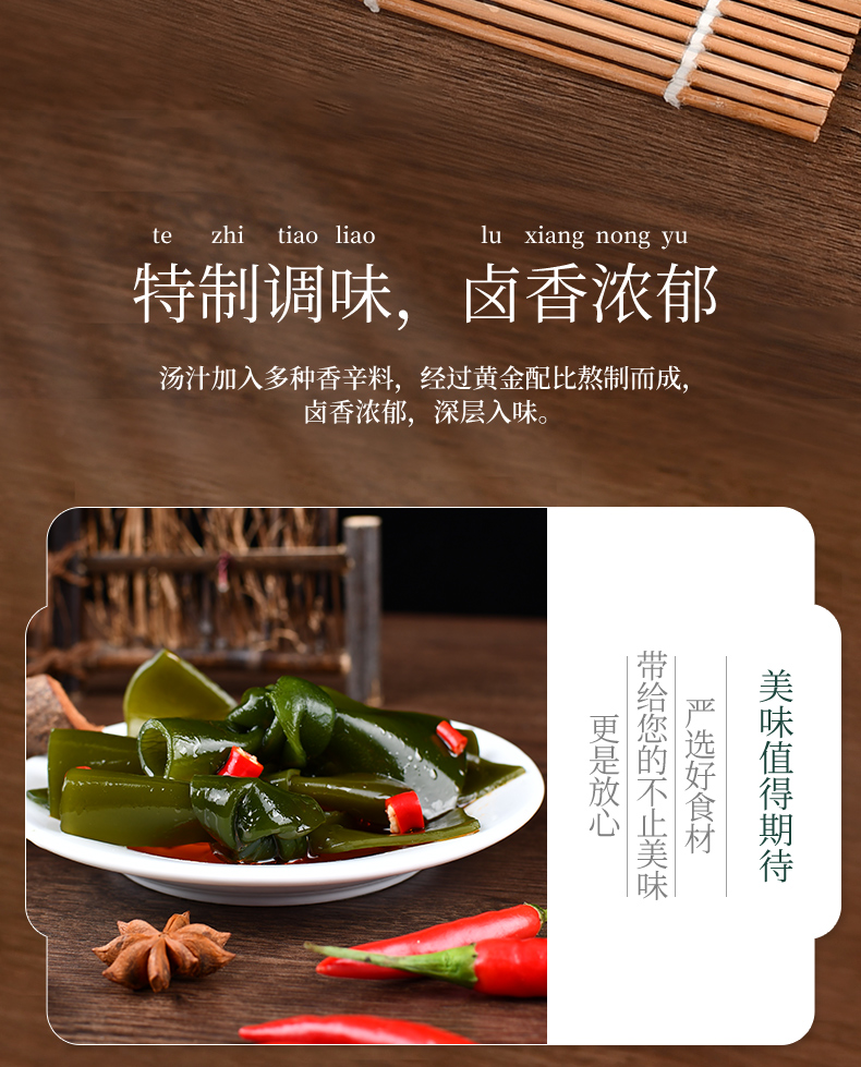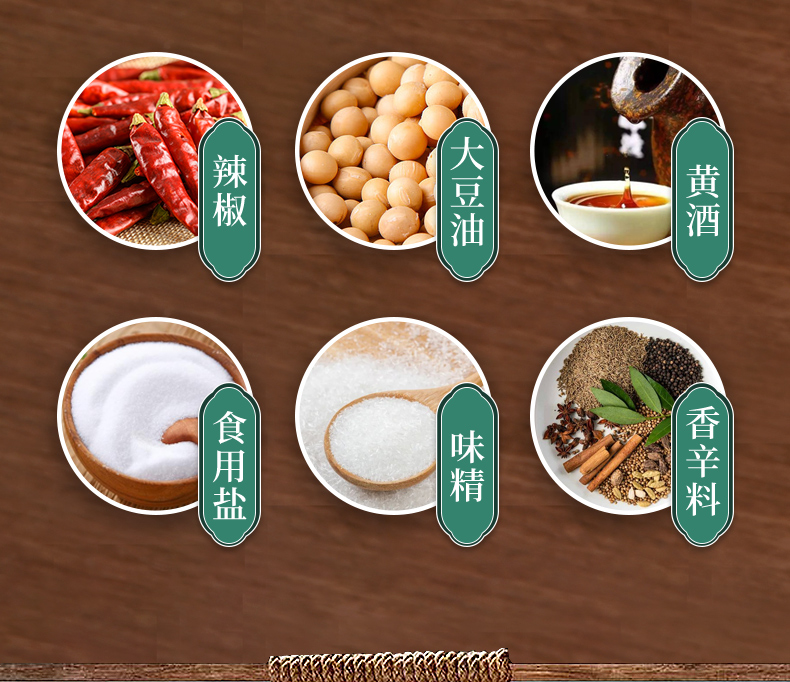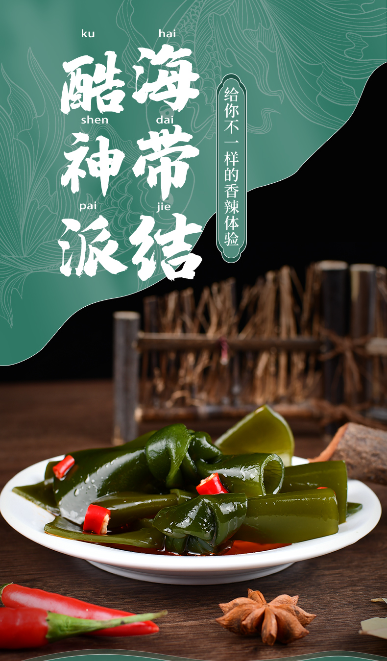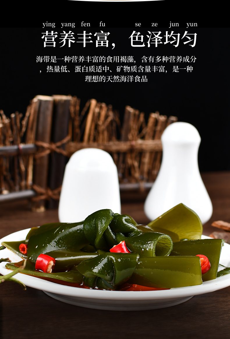 鹽漬海帶(海帶,食用鹽,脫氫乙酸鈉)(≥80%),水,大豆油,食用香精香料,食用鹽,味精,辣椒,黃酒,香辛料,5’-呈味核苷酸二鈉,檸檬酸,冰乙酸,乳酸,D-異抗壞血酸鈉,安賽蜜,山梨酸鉀。