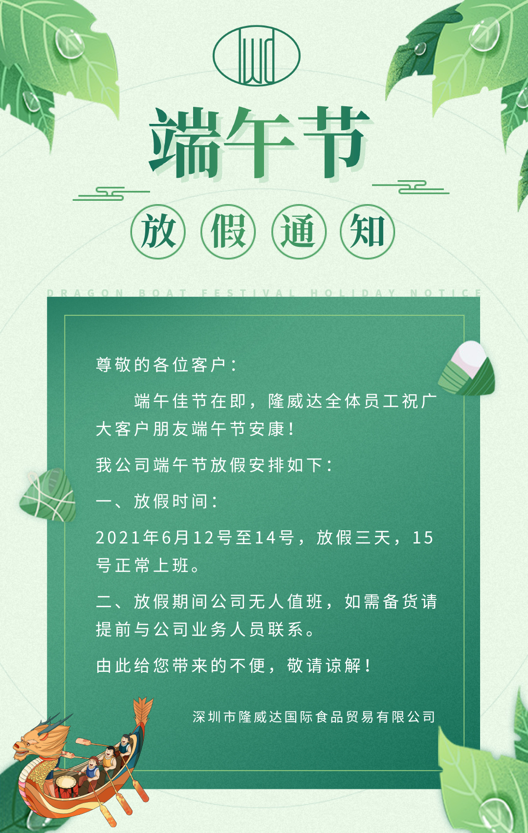 關(guān)于2021年隆威達端午節(jié)放假安排通知