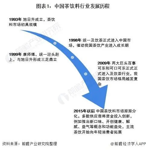 1993年旭日升系列茶飲橫空出世,拉開了我國茶飲料行業(yè)的序幕,距今,茶飲料在我國已發(fā)展了27年。從茶飲料的發(fā)展歷程來看,我國茶飲料市場經(jīng)歷了幾個重要的發(fā)展節(jié)點: