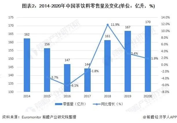 從我國茶飲料的生產(chǎn)情況來看,根據(jù)Euromonitor相關數(shù)據(jù),2014-2019年我國茶飲料零售量呈現(xiàn)先降后增的波動趨勢,2019年我國茶飲料零售量約為167億升,同比增長3.4%;根據(jù)我國飲料行業(yè)整體行情初步判定,2020年中國茶飲料零售量約為170億升。