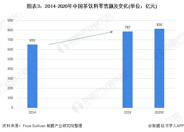 從我國茶飲料行業(yè)零售額變化情況來看,根據(jù)Frost & Sullivan統(tǒng)計數(shù)據(jù),2014-2019年間我國茶飲料零售額呈增長之勢,從2014年的653億元增長到了2019年的787億元,年復合增長率約為3.8%;按照增速預計,2020年我國茶飲料零售額約為816億元。