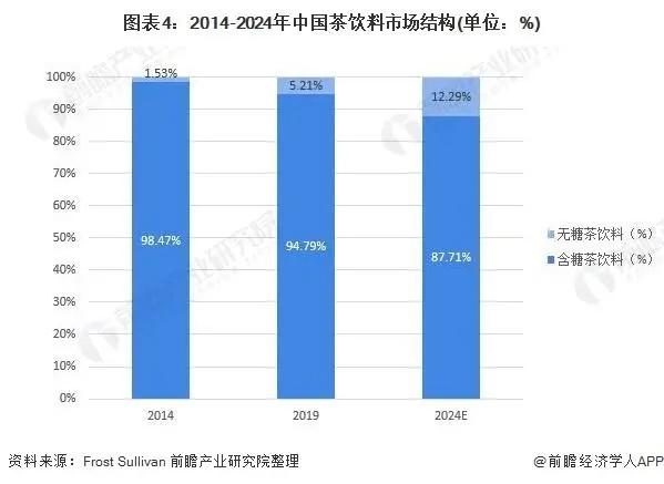根據(jù)Frost & Sullivan統(tǒng)計數(shù)據(jù),在我國茶飲料市場中,含糖茶飲料市場仍然是我國茶飲料的主要市場,但是無糖茶飲料的市場份額卻呈現(xiàn)明顯的占比增加的趨勢,2014-2019年,我國無糖茶飲料市場占比從2014年的1.53%增長到了5.21%,并且預計到2024我國無糖茶飲料的市場占比將增長到12.29%。