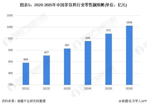 隨著中國人民生活水平及支付能力的不斷提高,人們越來越關注自身的健康。茶飲料中茶的健康形象成為消費者選購該類產(chǎn)品的一個重要動力。預計到2026年我國茶飲料行業(yè)零售額將達到千億元以上,約1006億元。